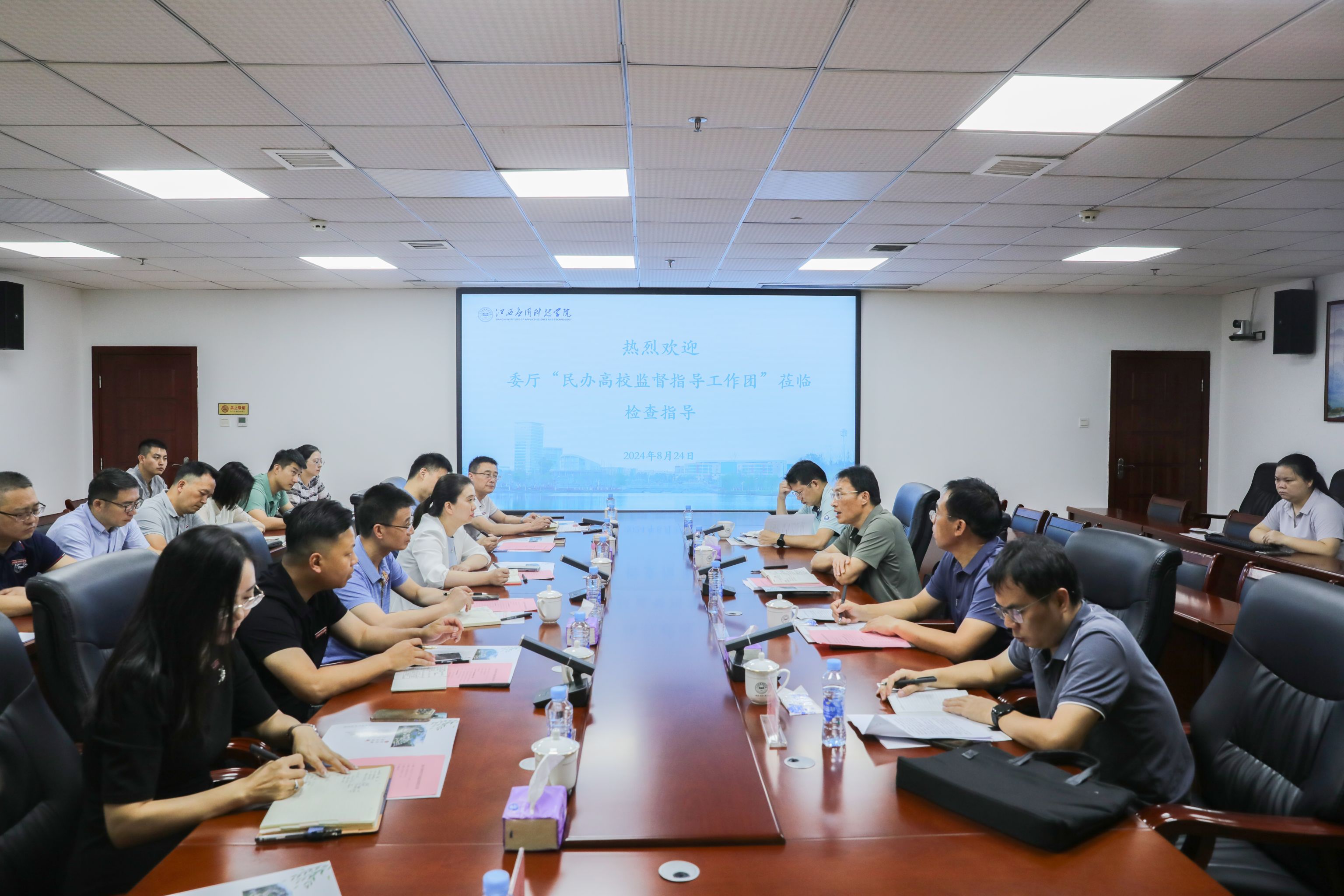 8月24日上午,根据江西省委教育工委、省教育厅工作安排,民办高校监督指导工作团团长、东华理工大学党委宣传部部长刘剑斌,南昌航空大学通航(民航)学院党委书记徐勇、南昌大学学生工作处副处长喻华宝、省教育厅教育技术与装备发展中心副主任张翔一行莅临best365官网就开学准备情况和校园安全工作进行检查指导,并在综合楼6楼会议室召开座谈会。学校党委书记贺一松,执行董事长王立,常务副校长干甜,党委副书记,纪委书记江星,副校长房小珍,张敏,校长助理曾昌盛,黎小明,党综办、校办、党委宣传部、学工处、教务处、财务处、总务处、保卫处、产教融合与实验实训中心等部门负责人参会。