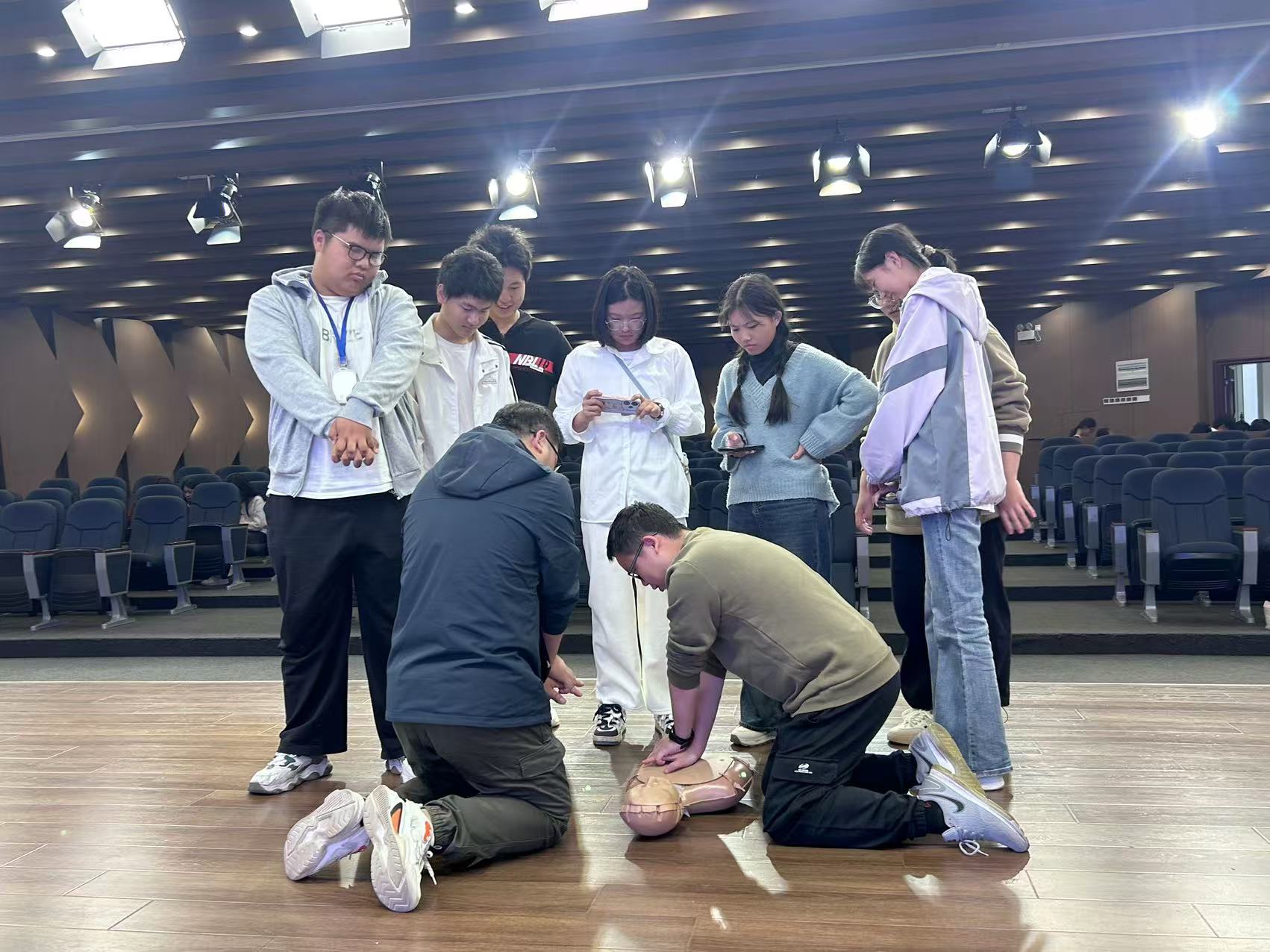 与此同时,在学辰林音乐厅,一场趣味横生的急救知识讲座也在进行。医疗队队员吴柳青携两位团队医生以诙谐幽默的语言、专业的知识,详细讲解了心肺复苏、海姆立克急救法等常见急救技能。医生们特别强调了心肺复苏的重要性,详细讲解了心肺复苏的步骤和注意事项,并邀请师生上台进行实操练习,他们提示大家常见的急救误区,纠正在操作中的问题,通过模拟真实场景,师生们亲身体验了心肺复苏的全过程,进一步巩固了所学知识,确保参与者都能真正掌握这些急救技能,以日后帮助自己避免或应对突发事件。