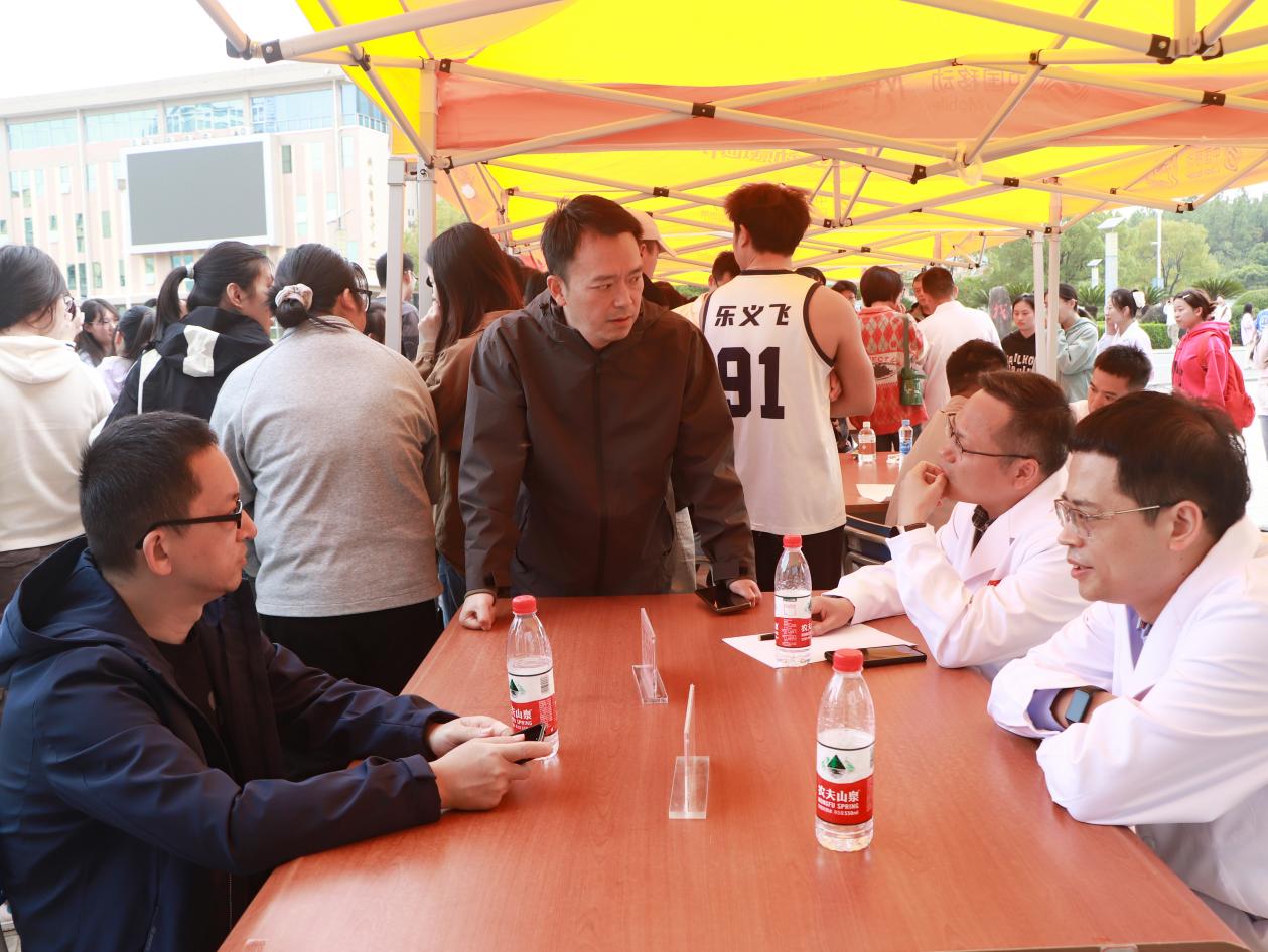 义诊活动在学校图书馆门前(开元大道旁)进行。此次义诊科室包括影像科、皮肤科、眼科、耳鼻喉科、中医科、妇产科、心内科、消化科及普外科等九个科室。现场提供免费的医疗咨询、血压测量、血糖检测,中医针灸、按摩等服务。师生们纷纷根据自身需求,选择相应的科室进行咨询,医疗专家们耐心细致地询问其相关病史、检查身体,并给予专业的健康咨询和诊疗建议。现场,医疗团队还教师生们打八段锦、向大家介绍简单有效的健康小窍门。