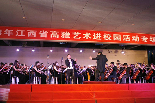 据悉,“高雅艺术进校园”活动旨在通过系列文化活动,让高雅艺术走入校园、走近学生,丰富校园文化生活,提高学生艺术修养,营造良好的校园文化环境,引领广大学生弘扬优秀民族文化,吸纳人类先进文化成果,提高艺术修养和文化素质,为“共圆中国梦”而刻苦学习、努力奋斗。江西师范大学交响乐团成立于1984年,曾担任过许多次省内外重大演出活动,积累了大量古典主义、浪漫主义和现代主义的中外交响乐作品,具有较高的艺术修养和演奏技巧。首场演出有中外经典名曲郑路、马洪业《北京喜讯到边寨》,莫扎特《第四十交响曲》,圣·桑《动物狂欢节》组曲,格里特《培尔·金特》第一组曲,双二重唱威尔第《祝酒歌》,贺绿汀《森吉德玛》,比才《卡门》序曲,吕其明《红旗颂》。