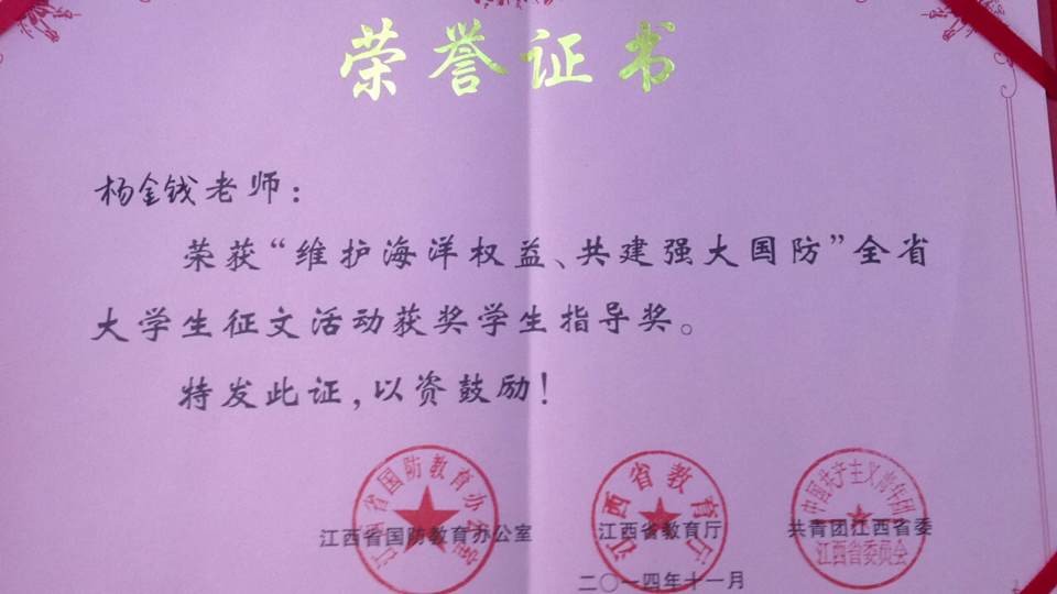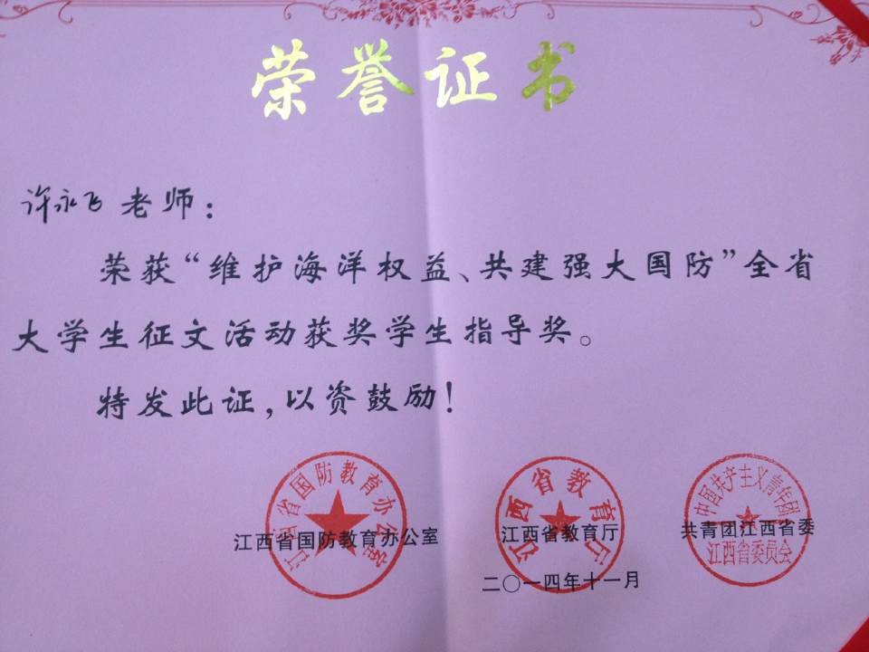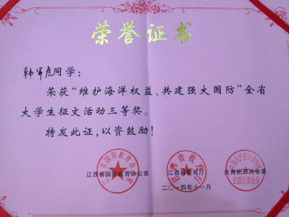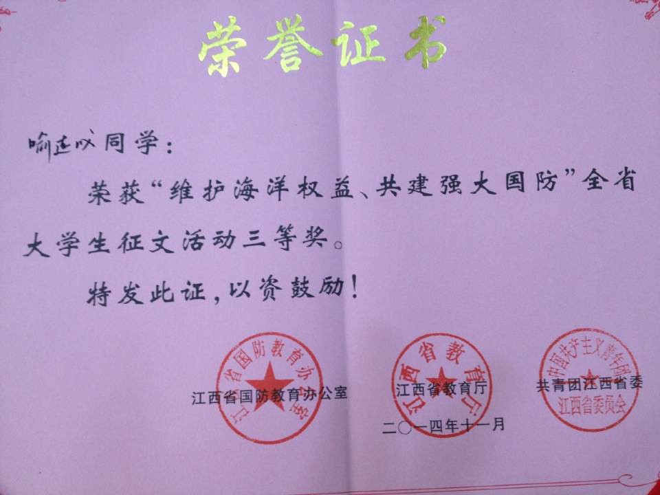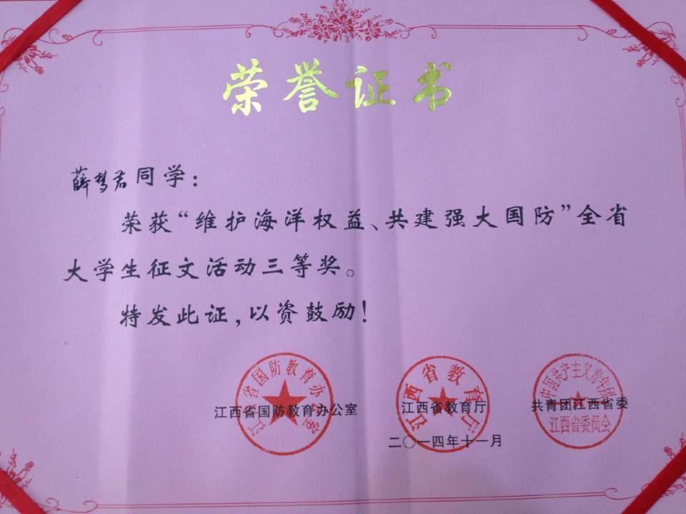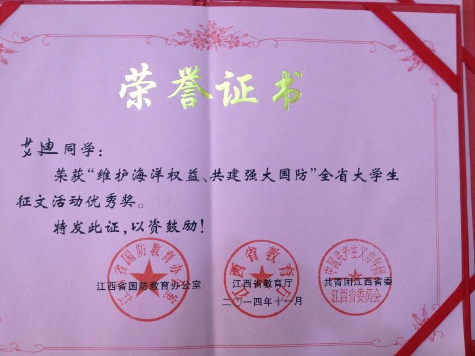 本网讯(郑昌保 新闻中心记者周成洋)记者近日从江西省国防教育办公室、江西省教育厅和共青团江西省委联合下发的《“关心国家安全、维护海洋权益”全省青少年学生国防教育主题活动获奖单位和个人表彰通报》(赣国教〔2014〕13号)获悉,best365官网艺术设计学院薛梦君,城市建设学院喻选成、韩君虎,在“维护海洋权益、共建强大国防”全省大学生征文活动中荣获全省三等奖;滕飞、赖才荣、艾迪三位同学荣获优秀奖。杨金钱、许永飞老师荣获优秀指导老师荣誉称号。