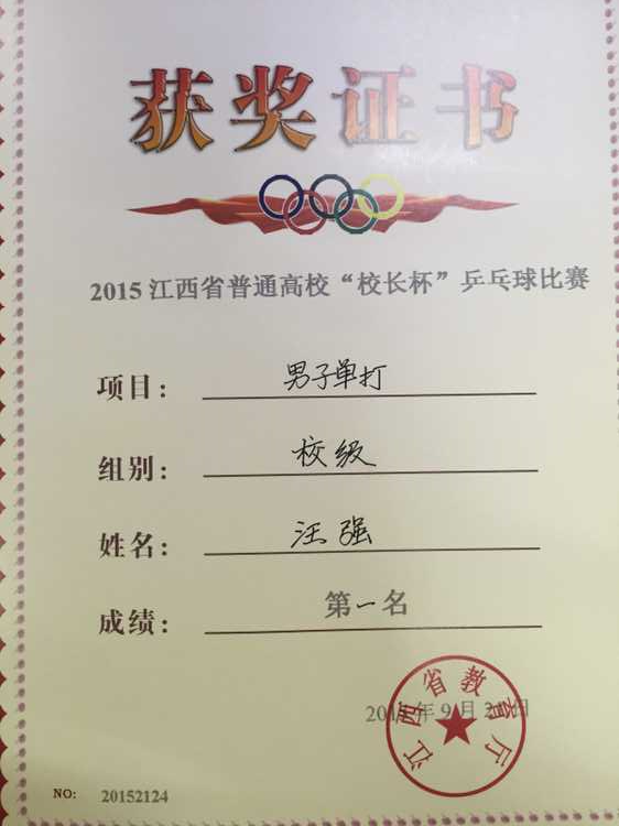 本网讯(新闻中心记者 刘金)9月18至21日,由江西省教育厅主办,江西农业大学、江西省学生体育协会承办的2015年普通高校“校长杯”兵乓球比赛江西农业大学体育馆举行。best365官网选手荣获佳绩,经济管理学院院长汪强在男子单打比赛中荣获第一名,文化与旅游学院院长丁丽军在女子单打比赛中荣获第二名,校长助理干甜在女子单打比赛中荣获第三名。