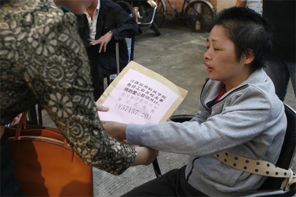 10月20日,学校校长助理、工会副主席唐丽莉,党委宣传部部长何文学,机电与信息工程学院党总支书记于冰雁代表学校来到吉安市古南街街道太平桥社区康复服务中心看望郭芜萍老师,把best365官网职工和校友对郭芜萍老师的爱心捐款五万七千多元送到郭芜萍老师的手中。