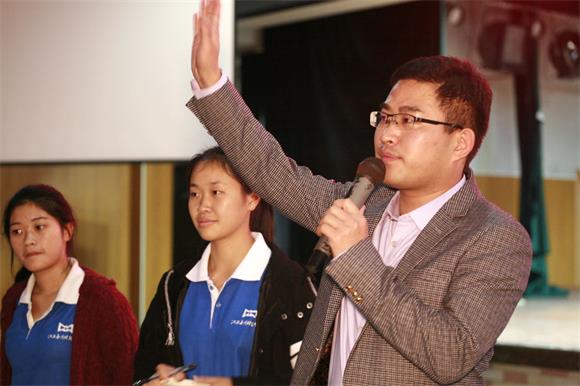 任何一场成功的报告会都离不开与听众的互动,杨瑞以现场问答的方式展开对“奋斗的青春最美丽”主题的阐释。五位同学提出了自己的想法,第一个谈到如何处理学习与生活,杨瑞首先表明了当代大学生应该要注重生活质量,只有一个好的身体才能够为自己的青春、为自己的人生打拼一片天地。其次他认为宿舍是我们大学生活中非常重要的一个地方,室友如同家人,而我们待的最长时间的也是宿舍,那是一个包括我们的生活,我们的友情亲情的地方。第二个谈到他在大学时的经历,学校的绿林青年环保会便是杨瑞创建的,从大一的默默无闻到在江西省联合会工作,他完成了自己的一个蜕变,而他一直相信“大学不要仅局限于校园,应该多读书多去城市里逛逛”。第三个谈到他的大学职业规划,杨瑞说在进大学校门时自己便有了目标,而此次他也跟我们讲了一个今后人生中不得不面临的问题——爱情问题。爱情问题是一个永恒的问题,他认为我们也要有一个爱情规划,勇于追求,坚持理性。他用习近平主席的“家风”思想告诉我们要正确理性的对待爱情。第四个第五个讲到一个共同的话题“人生与梦想”,杨瑞坦言现在的自己仍在迷茫之中,他认为自己应该成为一个文人,一名教师,然而现实当中自己没有成为任何一个,于是他关注历史学,希望从中找寻自己对人生的理解与看待生命的态度。他告诫我们在大学的生涯中一定要树立自己的理想,并为之而奋斗。