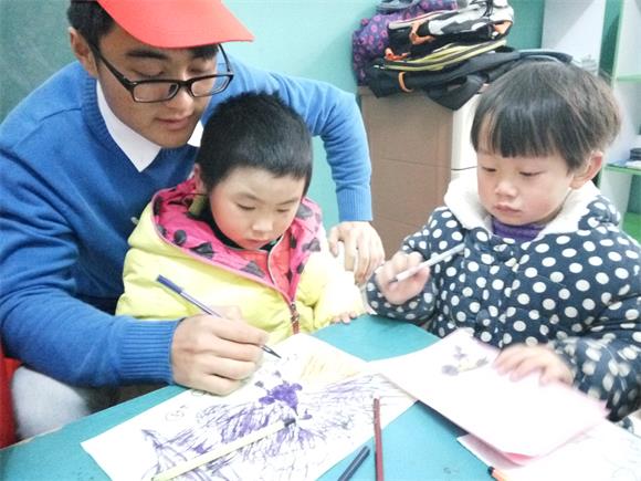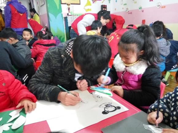 等到小朋友们午休完毕后,志愿者带着小朋友们开始了手盖油画。在一张很大的画纸上,志愿者和小朋友们一起完成了一幅美丽的树景图。