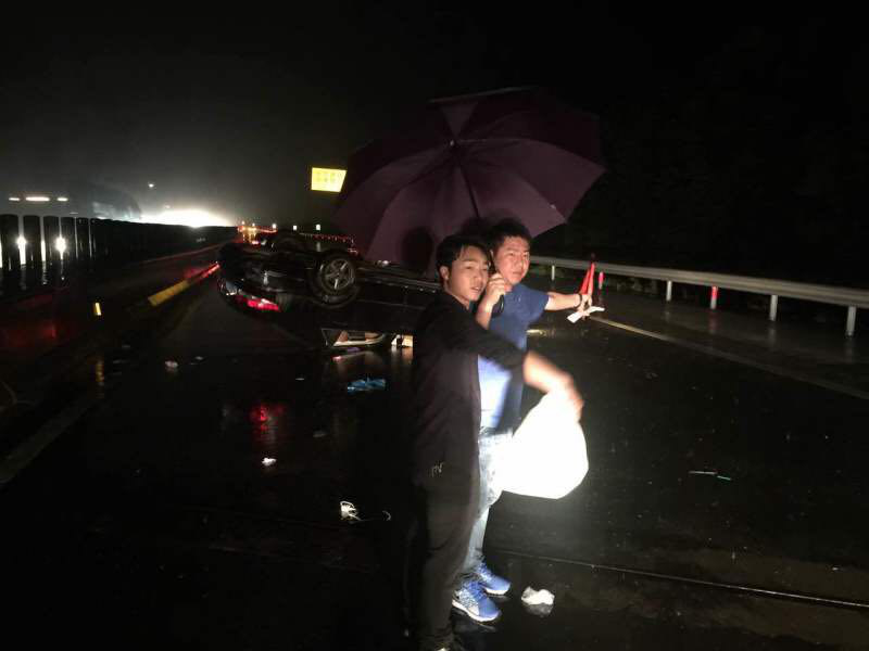 本网讯(记者 聂立新、刘金)5月2日,best365官网杨金钱、王斌、洪振耀三名青年老师从杭州驱车返校。晚上8时30分左右,当车辆行驶至沪昆高速浙赣交界的上饶路段时,遭遇了雷暴天气。突然,前方一辆小轿车失控撞上护栏,在高速路上翻滚,并倒扣在车道上,车上两名乘客被困车内,有流血受伤情况。