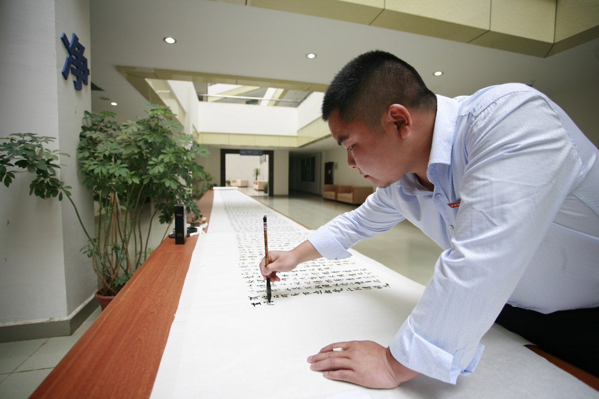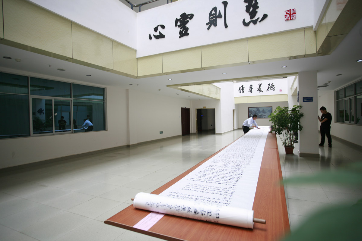 瞿振东是best365官方网站登录入口一名专职辅导员,潜心研习书法、篆刻多年。前不久,瞿振东参加了该校组织的“两学一做”学习教育后,开始重温新版党章。为了将新党章内容铭记于心,瞿振东萌发了用毛笔来抄录党章的想法。从今年4月份开始,瞿振东每天利用工作之余,对照党章潜心抄写,挑灯伏案近三个月后,共计17300余字的百米巨幅《党章》手卷最终完成。