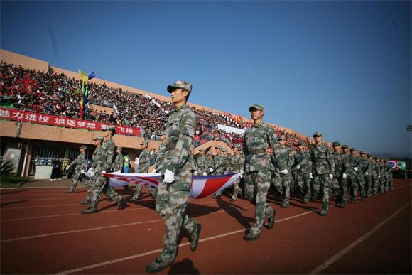 运动会开赛前,伴随着激昂的运动员进行曲,各学院运动员方阵迈着整齐的步伐,喊着响亮的口号步入会场。整齐划一的运动员代表队入场式表演很快就把现场的气氛带到了高潮。
