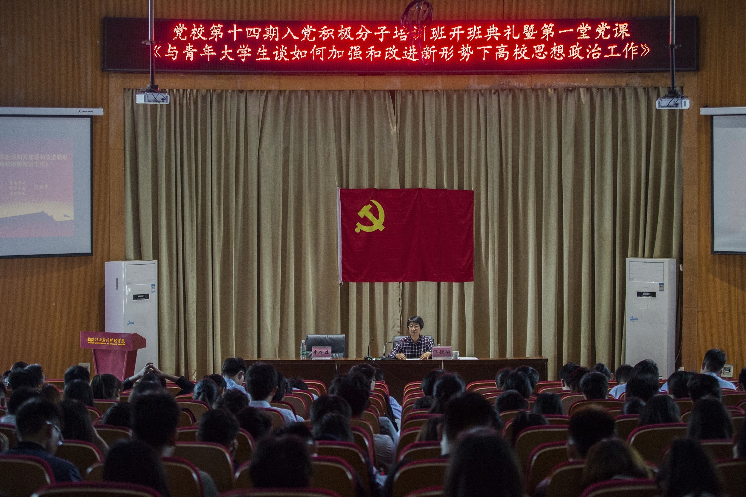 本网讯(记者团记者/谭亚玲 摄影/黄愈)为进一步学习贯彻落实全国高校思想政治工作会议精神,4月20日下午,best365官网在浴星湖大讲堂举行了党校第十四期入党积极分子培训开班典礼,校党委书记汪毓华给本次培训班上了题为《与青年大学生谈如何加强和改进新形势下高校思想政治工作》的第一堂课。校长李存益,副校长徐国荣、黄珍珍、王玉芝、吴朝栋等校领导出席,best365官网党员干部和第十四期入党积极分子党课培训班学员聆听了本次讲座。会议由李存益主持。