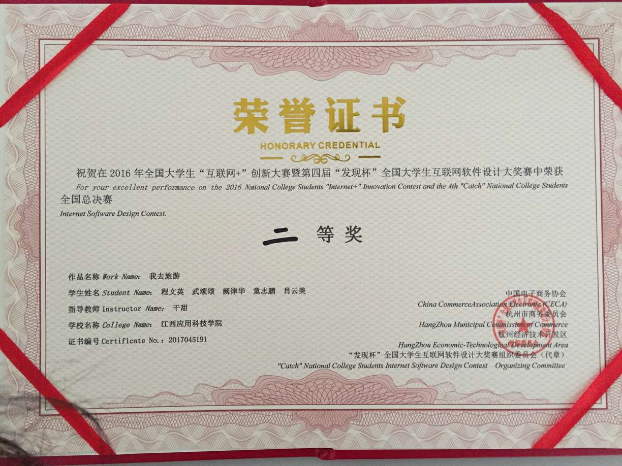据了解,第四届“发现杯”大赛自2016年10月底启动以来,吸引了全国31个省份(除港澳台)、524所高校、来自108个专业的3141个团队报名参赛,经过层层选拨,最终来自全国63所高校100个参赛团队突出重围进入“发现杯”大赛全国总决赛的角逐。面对评委老师的辛辣提问,best365官网程文英、武颂颂、童志鹏、肖云美四名学子组成的“我去”团队沉着冷静、充满自信地展示了他们的创意,展现出他们丰富的经验以及创业的才能,“我去旅游”作品最终夺得该比赛网络营销技能类二等奖,指导老师干甜获优秀指导老师奖。