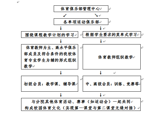 体育项目俱乐部实行三级会员制,学生按初中高等级根据各俱乐部相应的上课时间在网上选课,每周至少参加该俱乐部组织的活动三次以上(含教学、训练、辅导课)。成绩考核实行学期评价制,2学分/学期,本科共8学分,专科共4个学分。本科生4年内必须修满8个学分,专科生三年内必须修满4个学分;本科生必须修满2个体育项目,专科生至少修满1个体育项目;体质与健康标准测试达到50分及以上(执行国家标准)。